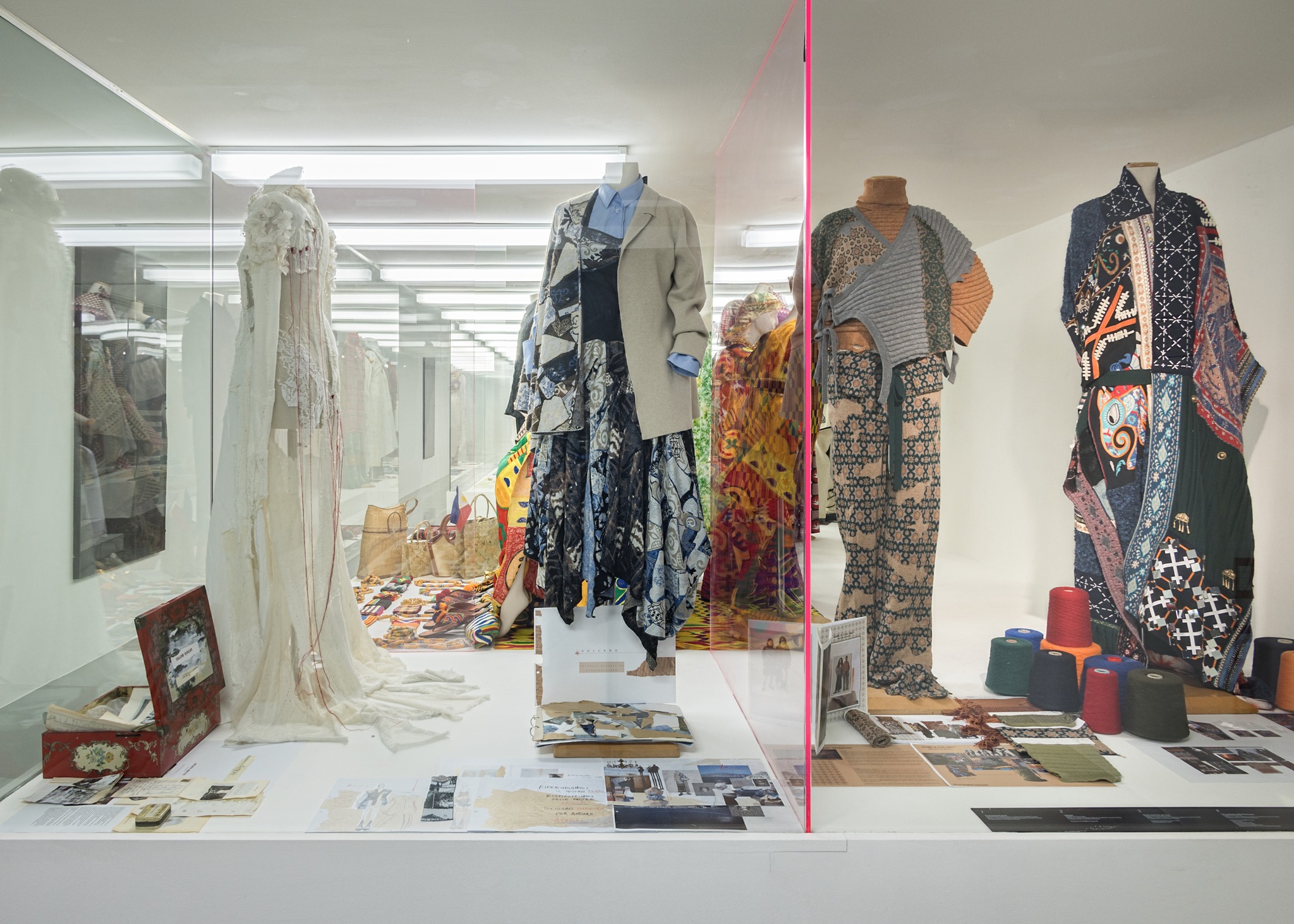 Nel percorso di mostra gli abiti delle comunità residenti a Reggio Emilia sono posti in dialogo con altri abiti della creatività professionale contemporanea – prototipi realizzati dagli studenti del Master in Creative Knitwear Design di Accademia Costume & Moda, in collaborazione con Modateca Deanna – che mostrano anch’essi evidenti tracce di persistenze e contaminazioni culturali, in cui sono ben riconoscibili identità e radici.